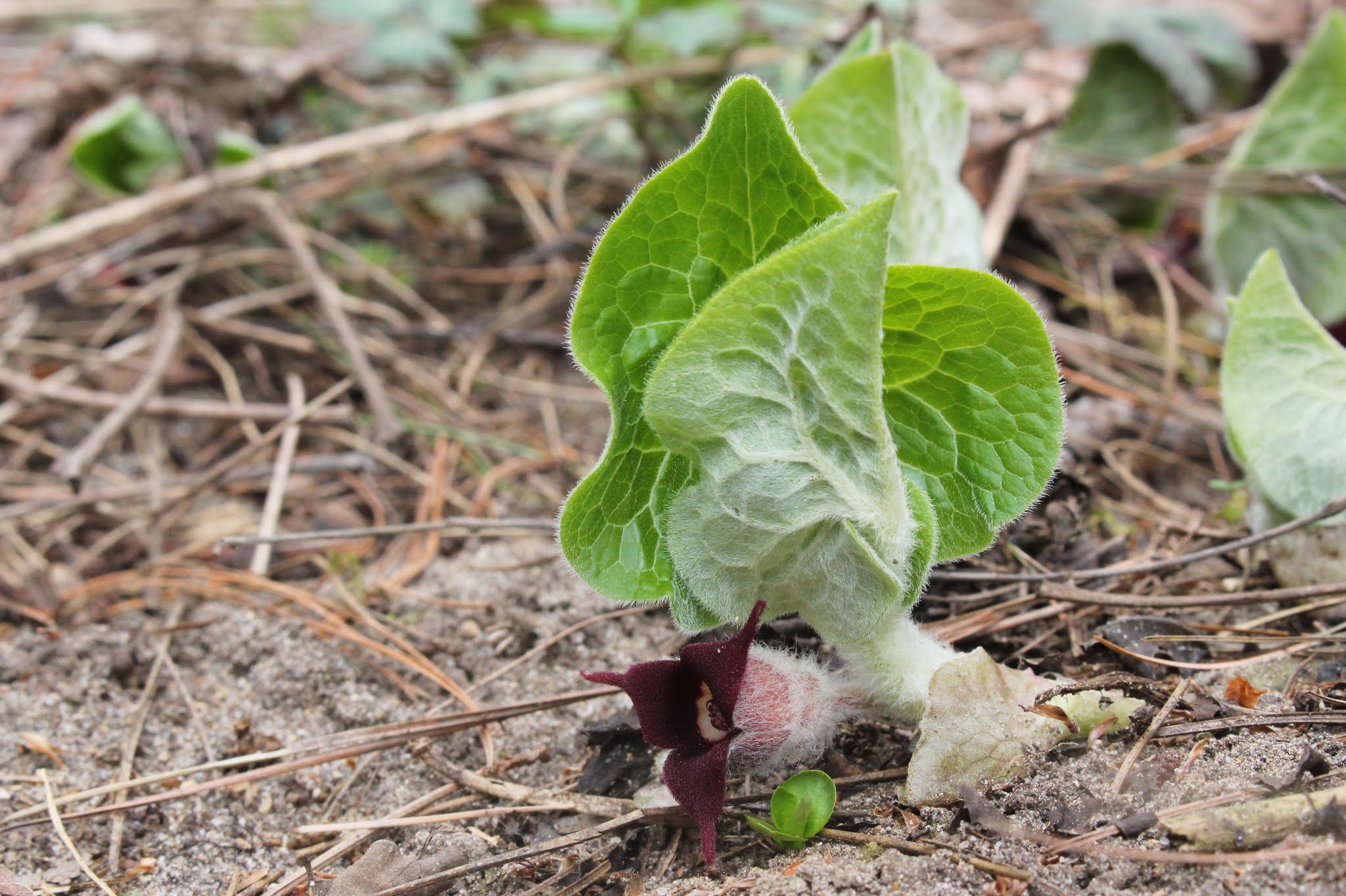 Canadian Wild Ginger (Asarum canadense) was beginning to bloom. The flowers lie on the ground, and this is because it is pollinated by ants.
